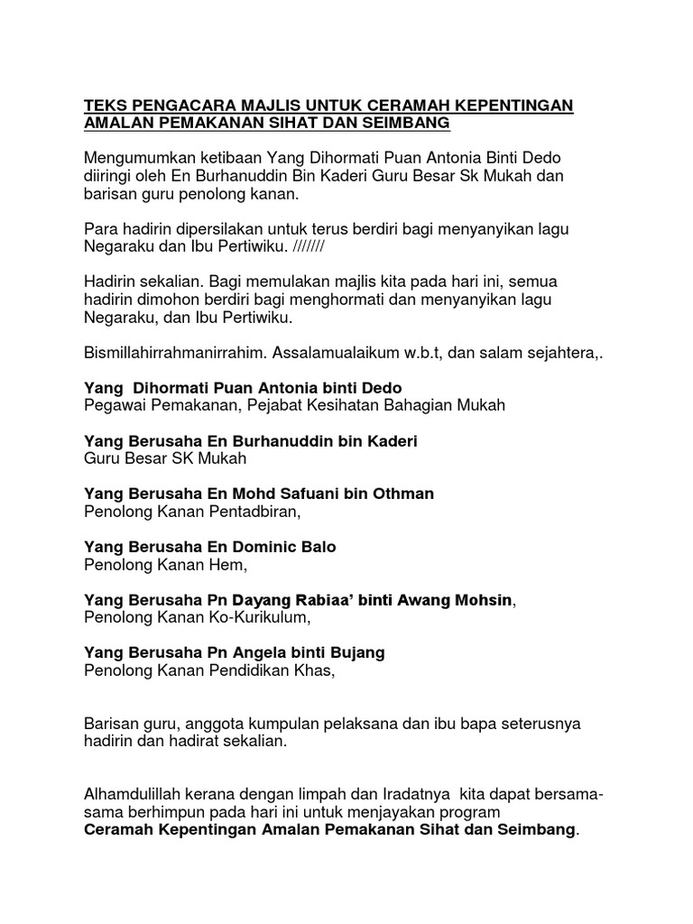Dalam Pengacaraan Majlis seorang pengacara majlis juga perlu mem variasi kan teks emceeAntara variasi yang saya biasa gunakan ialah pengabungan pantun gurindam dan lain-lain. Yang berusaha EN ABDUL RAHMAN BIN ISMAIL Guru Besar SK Bintulu Yang berusaha EN ADOL BIN SAID Penolong Kanan pentadbiran Yang berusaha PUAN MET NYUAWE Penolong kanan hal ehwal murid EN AMIR. TEKS UCAPAN YB TAN SRI DATUK SERI PANGLIMAJOSEPH KURUP TIMBALAN MENTERI SUMBER ASLI DAN ALAM SEKITAR SEMPENA MAJLIS PERASMIAN PENUTUPAN BENGKEL RAKAN ALAM SEKITAR PENSIANGAN 22 JULAI 2011 JUMAAT HOTEL JUTA KENINGAU Terima kasih saudarai Pengacara Majlis Selamat Pagi dan Salam 1 Malaysia.